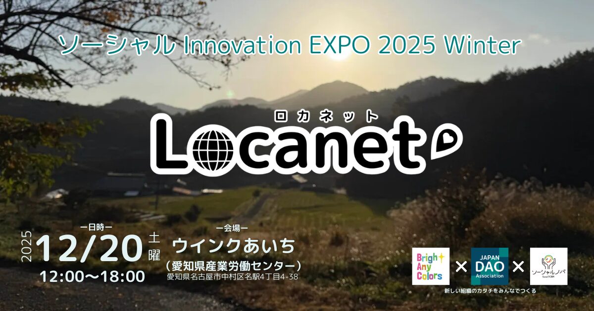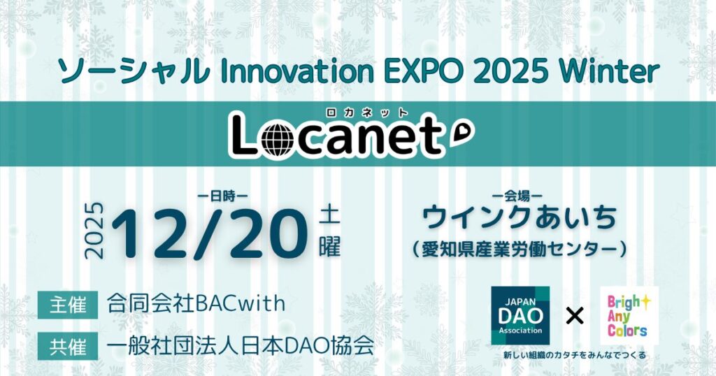 日本DAO協会は、2025年12月20日(土)、ウインクあいち(愛知県産業労働センター)にて「ソーシャル Innovation EXPO 2025 Winter~Locanet(ロカネット)~」を合同会社BACwithと共催します。