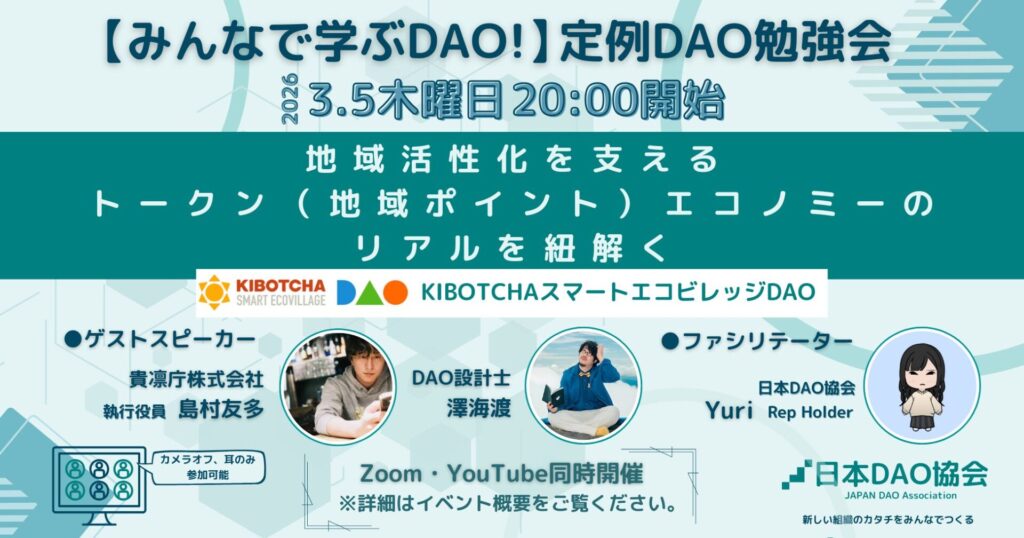 地域活性化を支えるトークン(地域ポイント)エコノミーのリアルを紐解く〜KIBOTCHAスマートエコビレッジDAO 〜【みんなで学ぶDAO!】定例DAO勉強会 3/5(木)20:00~ オンライン開催