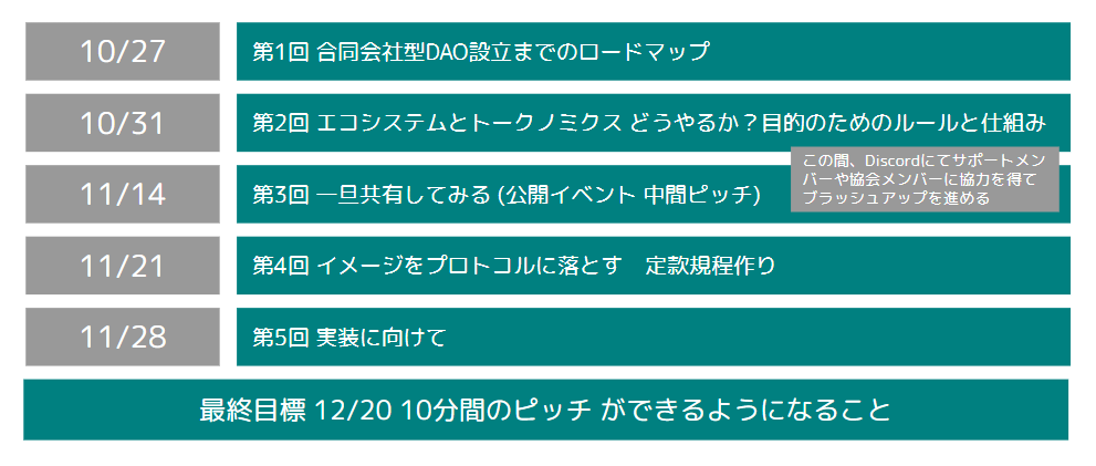 各参加者は、日本DAO協会メンバーによる法務・技術・運営の伴走支援を受けながら、合同会社型DAOの設立に向けた準備を進めていきます。